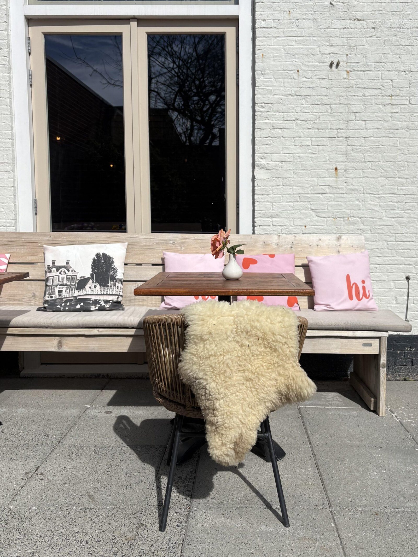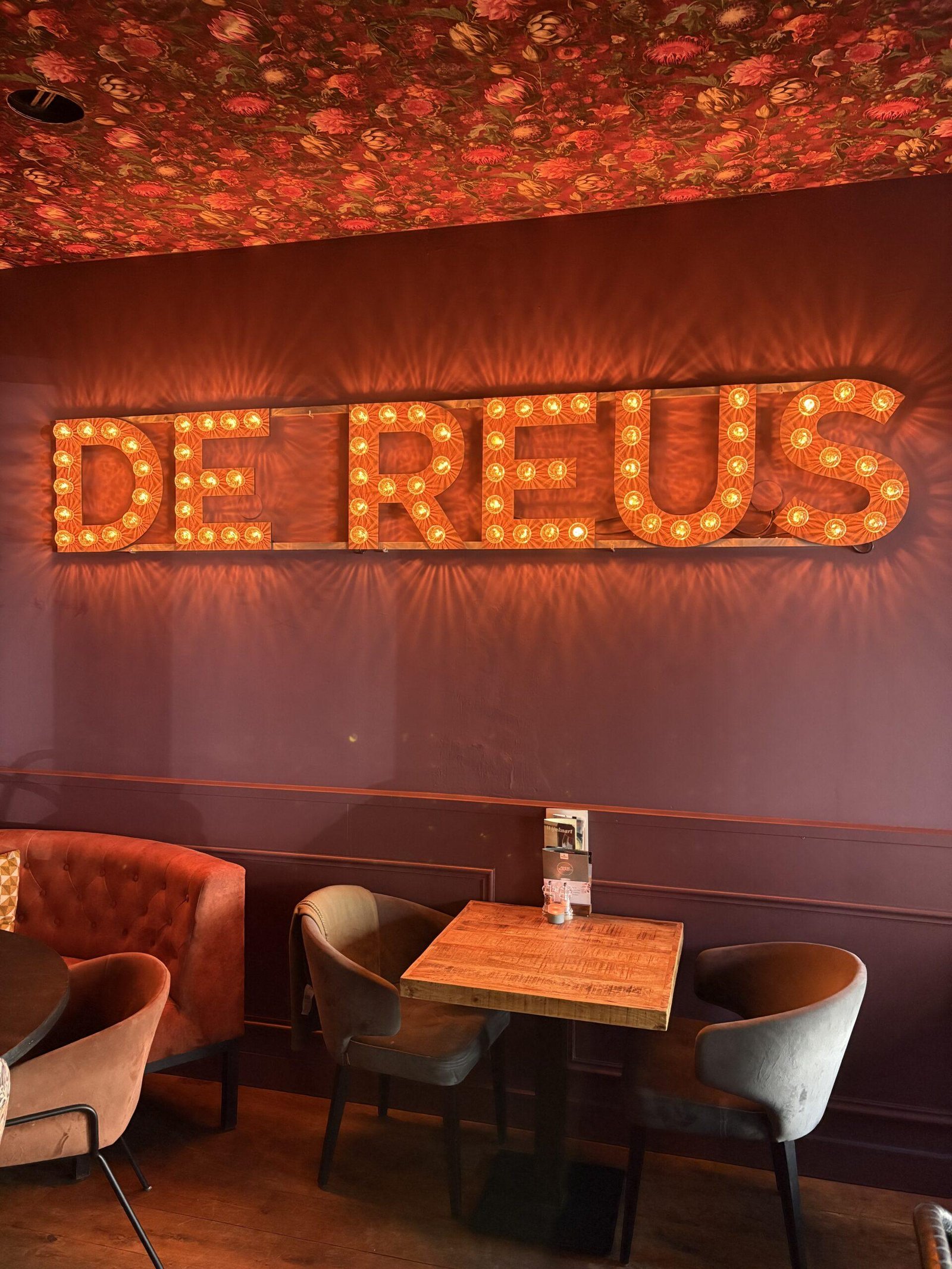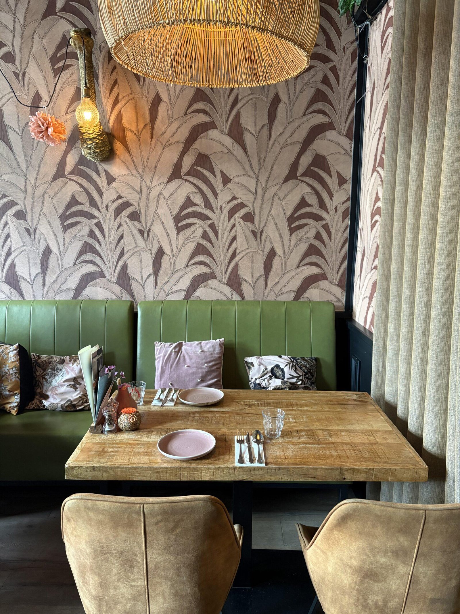 Vanaf het moment dat je binnenstapt, valt direct op hoeveel aandacht er is besteed aan het interieur. De mega grote letters op de muur, het stijlvolle behang en het prachtige servies van HK Living maken het geheel ontzettend aantrekkelijk. Alles klopt hier: van de eerste indruk tot de ontspannen sfeer aan tafel.